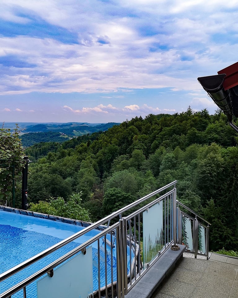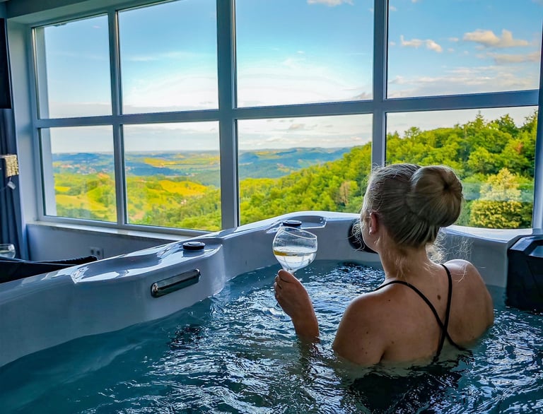 Sprostite se v finski savni, uživajte v topli vodi zasebnega jacuzzija, nazdravite v dvoje – vse ob slikovitem panoramskem razgledu, ki ob jasnem dnevu seže vse do Hrvaške.